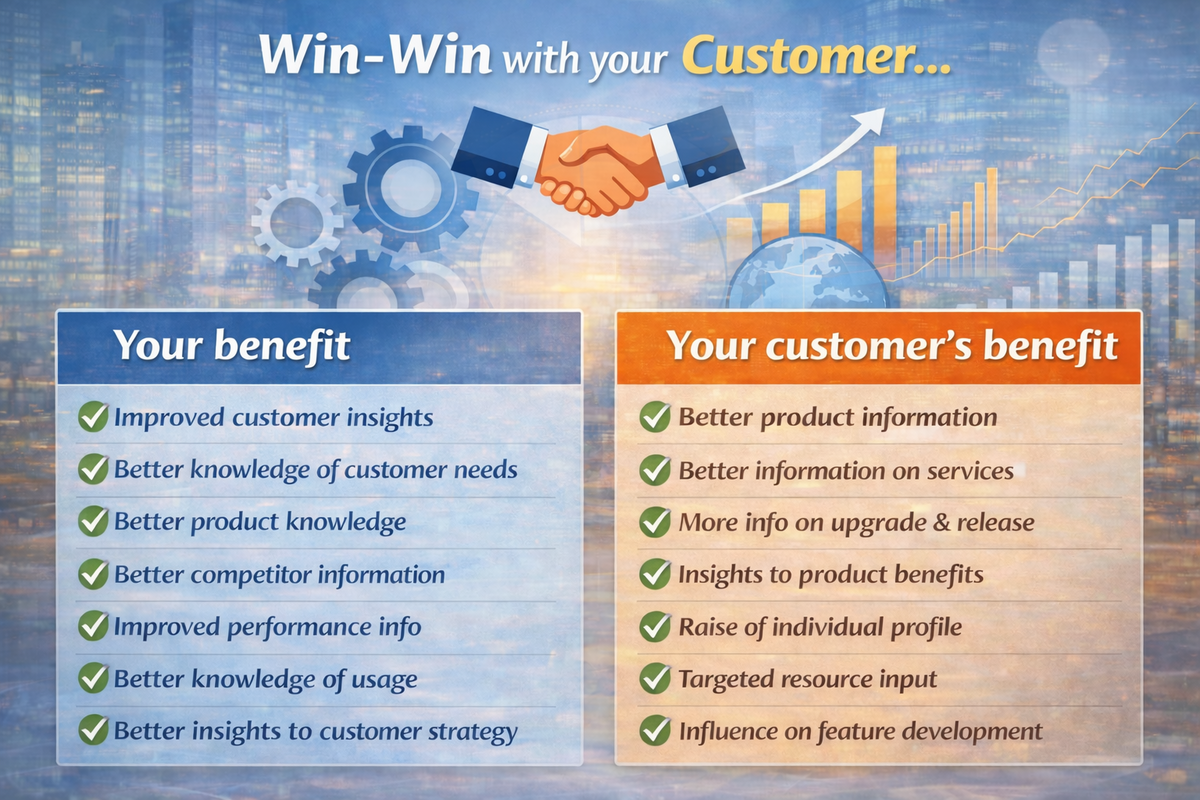 Your customers' benefits from clear product and service information, early insights into upgrades and releases, and a better understanding of product value. At the same time, they receive targeted support, can strengthen their individual profile and even influence product development.